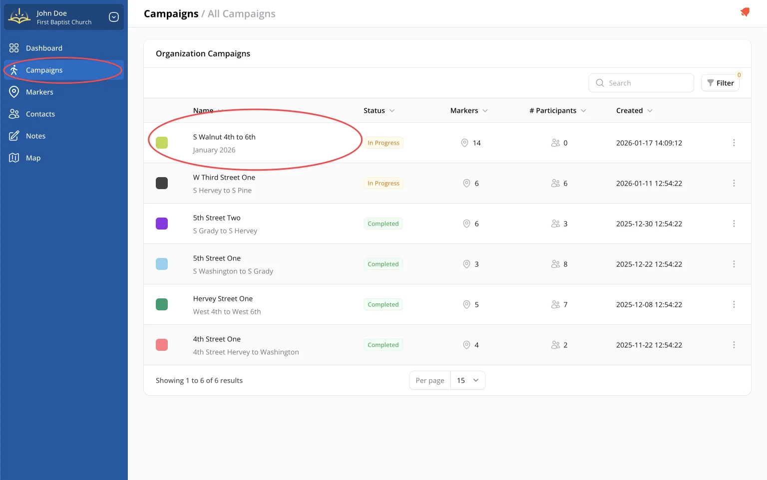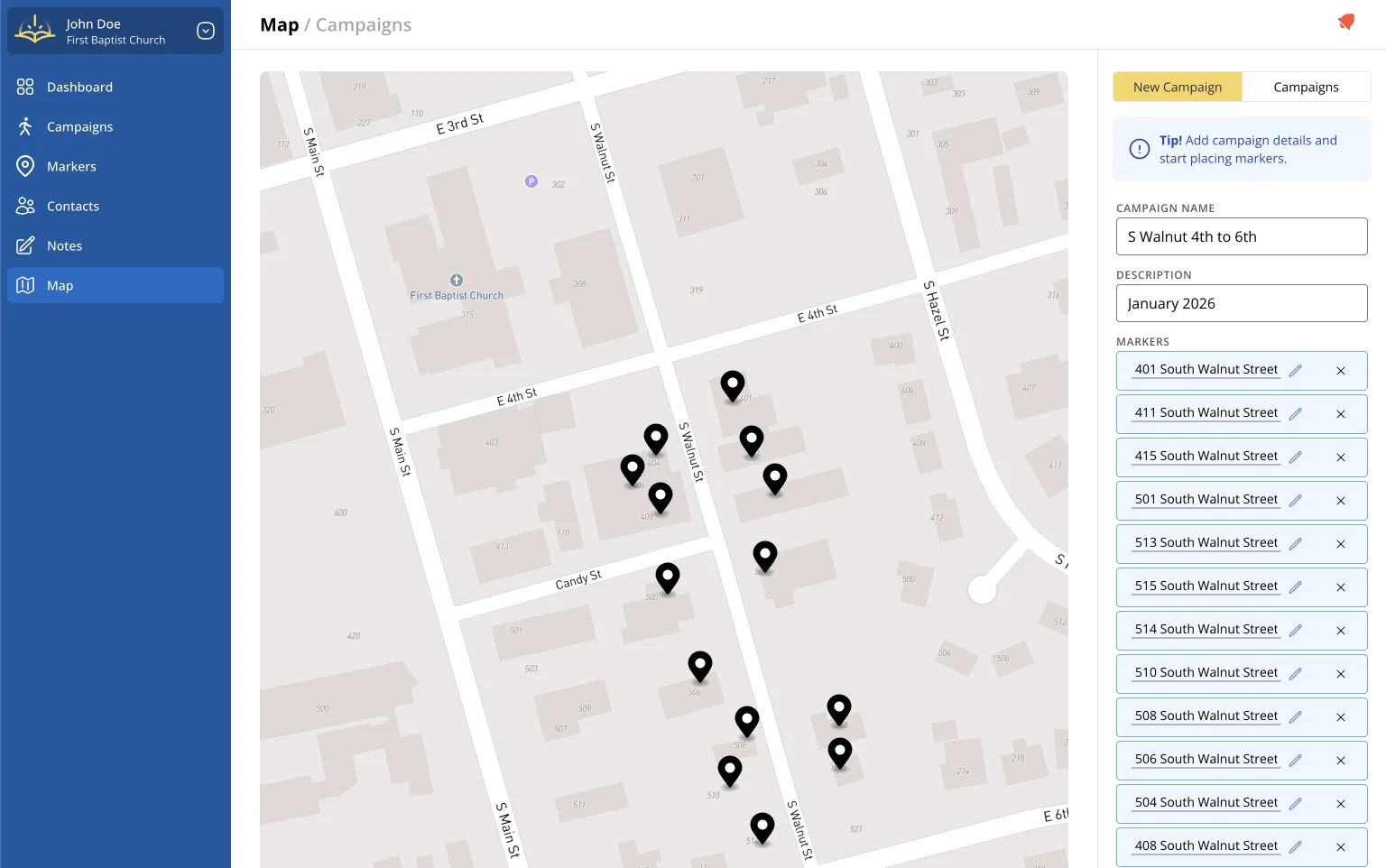 Campaigns are the heart of EvangeGo. They help you organize your outreach efforts by location and track your progress over time.