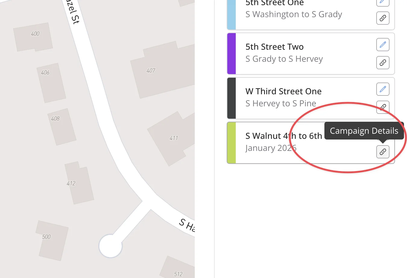 Click the New Campaign button in the upper-right hand corner of the screen. Next you will enter a descriptive name for your campaign (e.g., "Oak Street Neighborhood - January 2024").
